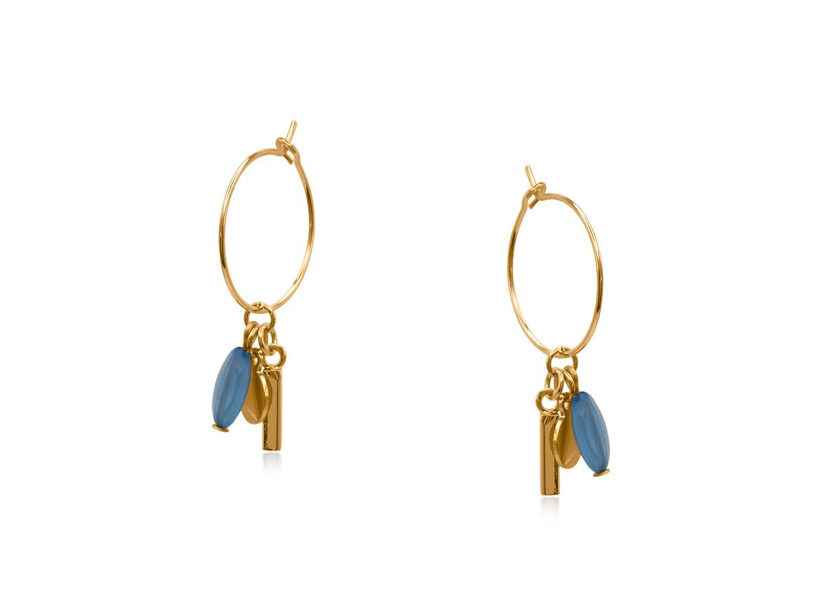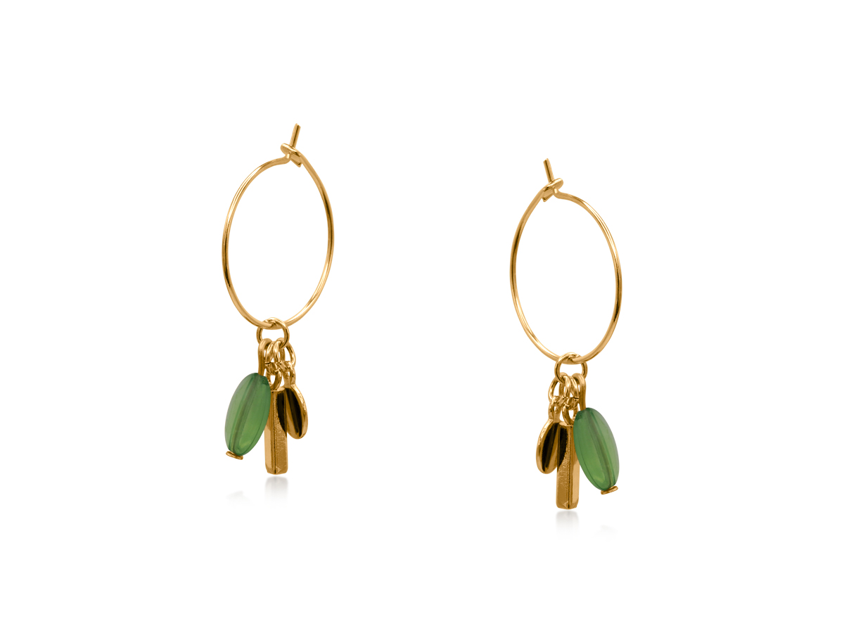 These handcrafted charm hoops feature a mix of smooth stone beads and polished gold accents, creating a playful yet minimalist statement. Available in blue or green, they’re perfect for adding a hint of colour and movement to any modern jewellery look. At least 50% of the brass used in the jewellery we make is recycled from leftover/overhead materials. All posts are hypoallergenic and made from surgical steel.