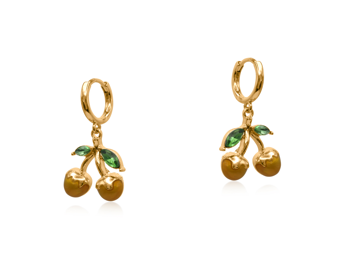 These handcrafted fruit huggies feature glossy enamel fruit charms with faceted green leaves, suspended from sleek gold hoops. Available in red or yellow, they add a playful pop of colour and a touch of retro charm to any outfit. At least 50% of the brass used in the jewellery we make is recycled from leftover/overhead materials. All posts are hypoallergenic and made from surgical steel.