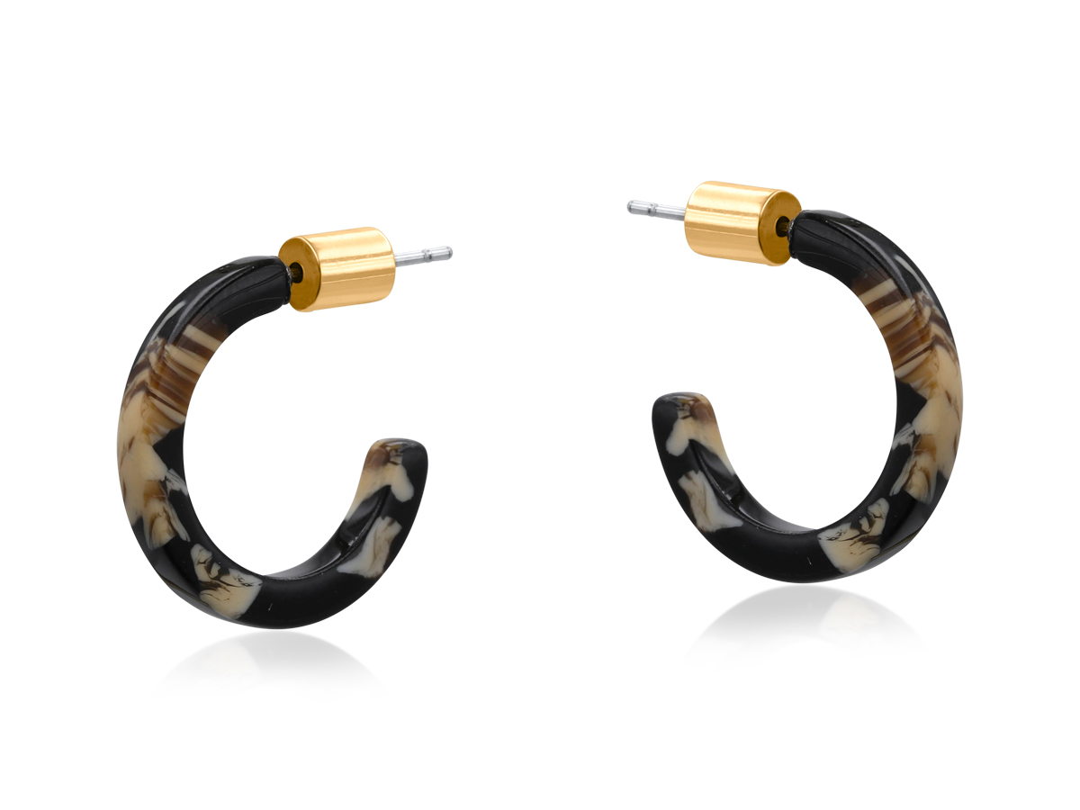 Make a statement with these modern resin hoop earrings—crafted for those who love clean lines with a burst of personality. Their smooth, translucent curves are formed using recycled resin, giving each pair a unique, marbled finish that subtly shifts in tone and texture. Designed for all-day comfort with hypoallergenic surgical steel posts and gold-plated accents, these hoops offer the perfect blend of lightweight wear and bold detail. Whether paired with a sleek outfit or layered with other favourites, they bring a polished, contemporary touch to your everyday look.