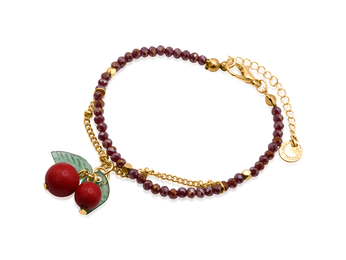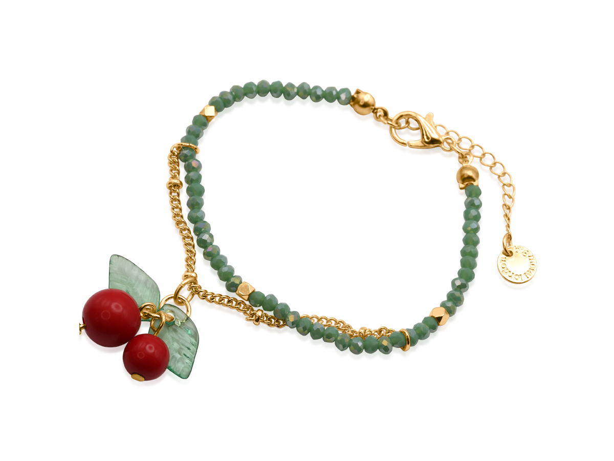 This beautiful handcrafted bracelet features a double cherry charm with glossy red beads and translucent green leaves, set on a delicate beaded chain in rich red, navy, and green tones. A playful yet striking piece that brings a fresh pop of colour to any look, all year round. Crafted with sustainability in mind, at least 50% of the brass we use in the jewellery is recycled from leftover/overhead materials.