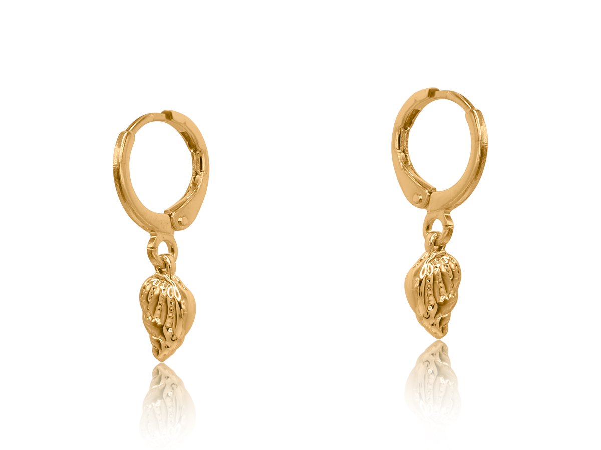 Inspired by coastal keepsakes, the Lucia Sea Token Earrings feature a delicate conch shell charm suspended from a compact huggie hoop. Subtle yet distinctive, they add effortless seaside character to everyday looks.