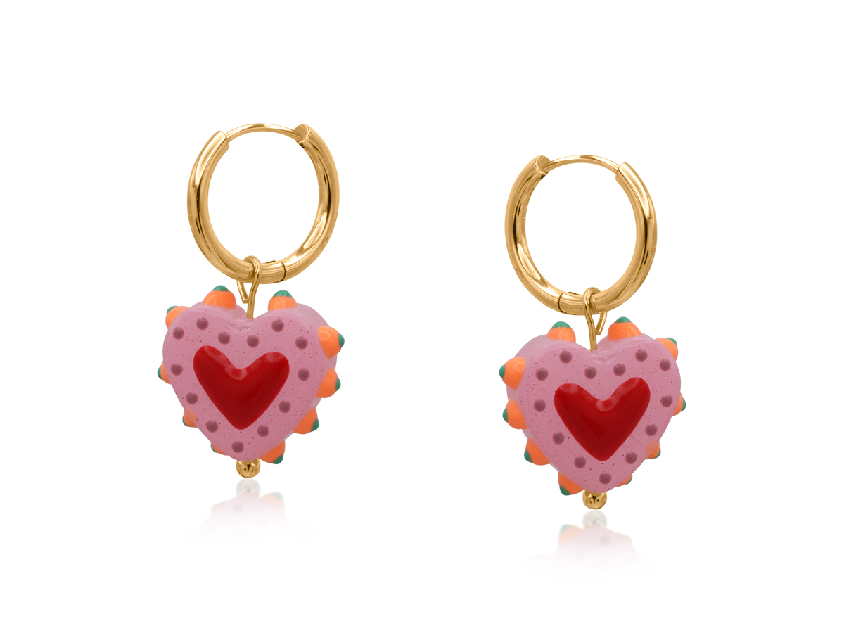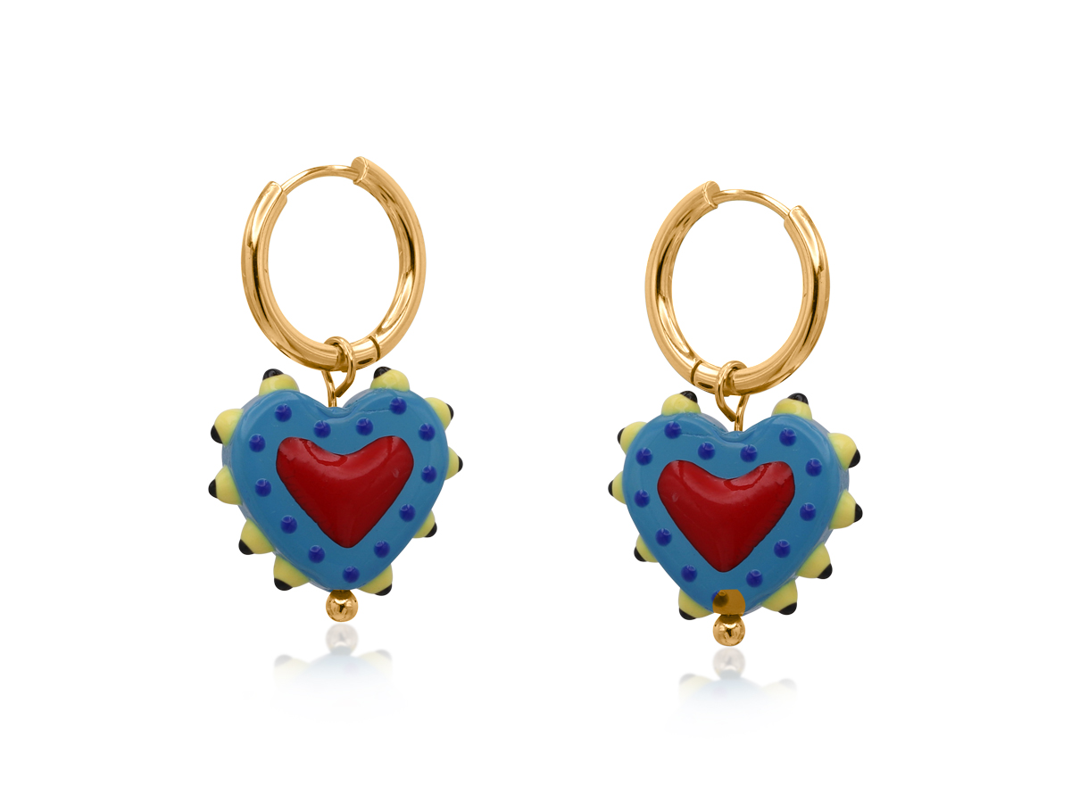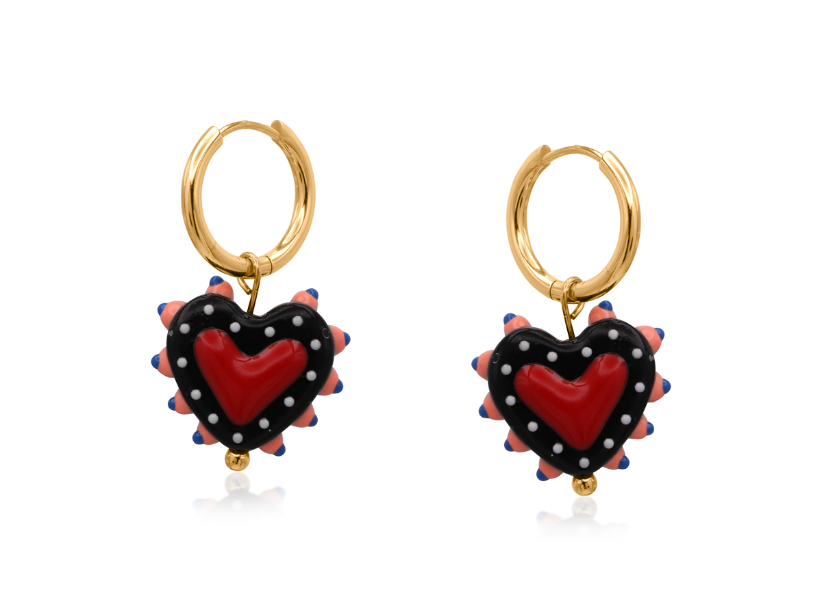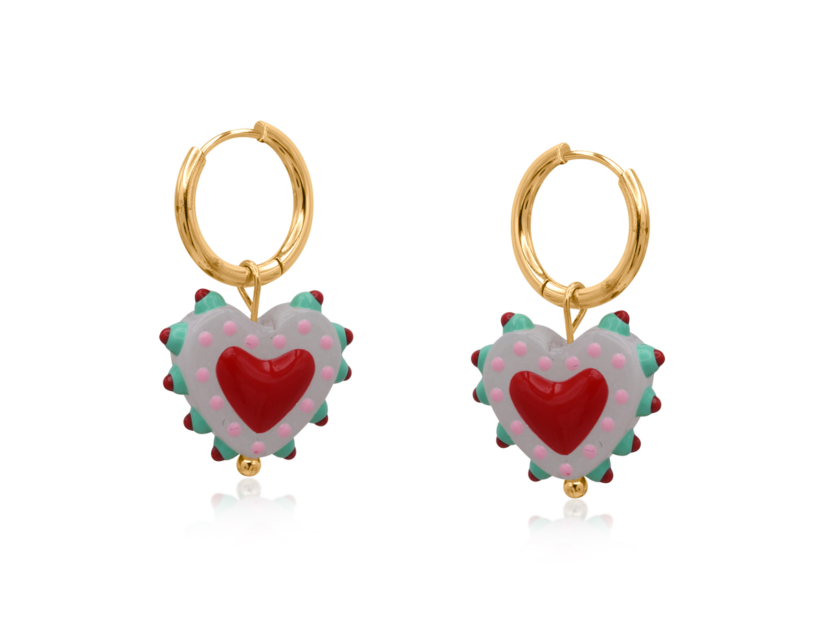 Playful with a rustic edge, the Santa Fe Heart Charm Earrings feature a softly sculpted red heart charm against a bright backdrop, influenced by artisanal desert design. Their compact silhouette makes them easy to style across seasons.