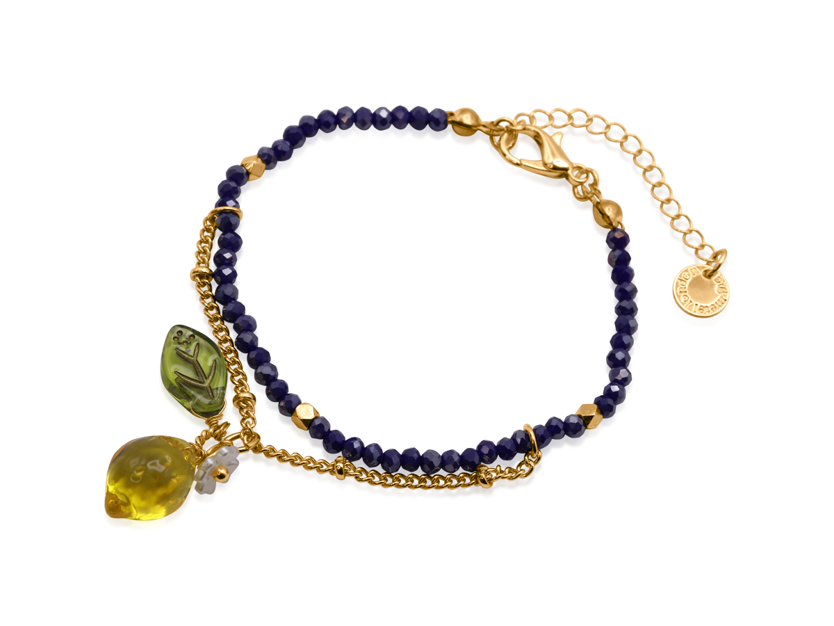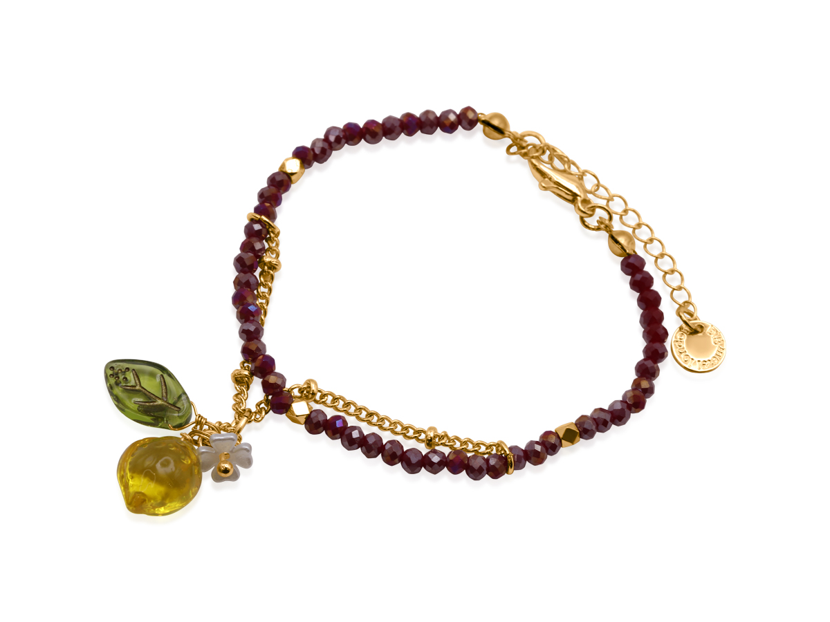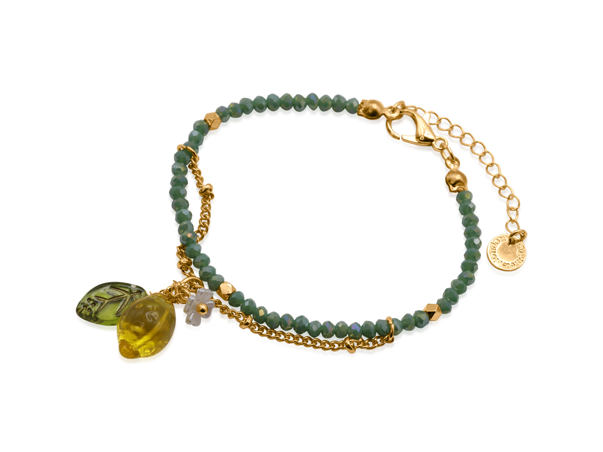 Bright and zesty, this handcrafted beaded bracelet set features three stackable strands in green, navy, and deep red tones, finished with a vibrant lemon and leaf charm. A playful nod to citrus season that adds a fresh twist to any look. At least 50% of the brass used in the jewellery we make is recycled from leftover/overhead brass.