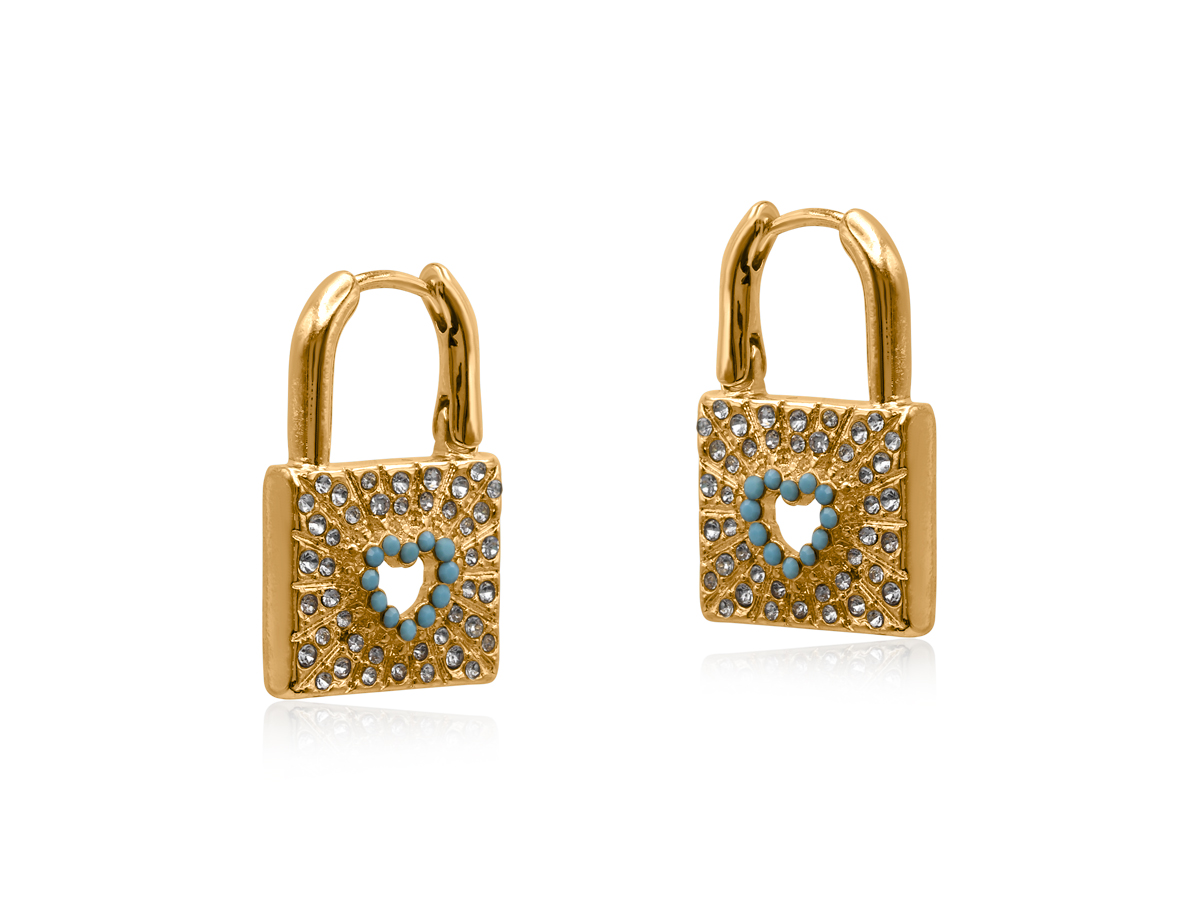 These handcrafted Siren’s Padlock Huggies feature bold rectangular lock charms encrusted with clear crystals and finished with a delicate heart-shaped cut-out framed in turquoise. A striking symbol of love and protection, these statement huggies add sparkle and edge to any look. At least 50% of the brass used in the jewellery we make is recycled from leftover/overhead materials. All posts are hypoallergenic and made from surgical steel.