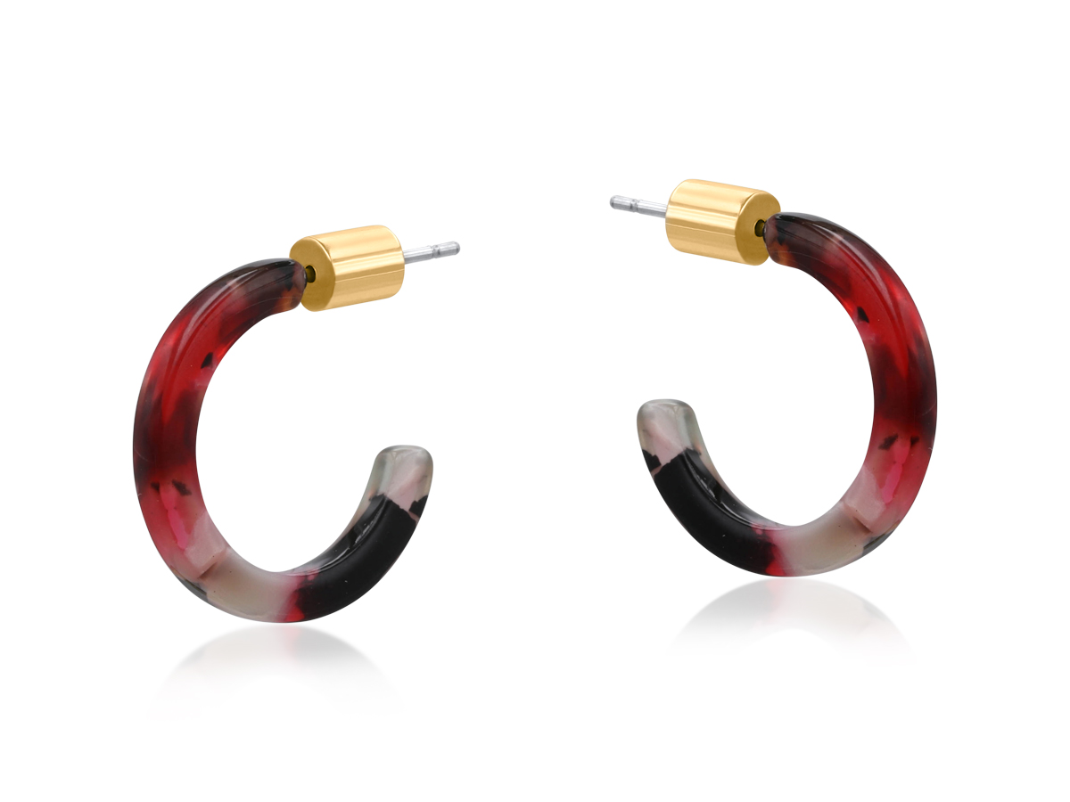 Make a statement with these modern resin hoop earrings—crafted for those who love clean lines with a burst of personality. Their smooth, translucent curves are formed using recycled resin, giving each pair a unique, marbled finish that subtly shifts in tone and texture. Designed for all-day comfort with hypoallergenic surgical steel posts and gold-plated accents, these hoops offer the perfect blend of lightweight wear and bold detail. Whether paired with a sleek outfit or layered with other favourites, they bring a polished, contemporary touch to your everyday look.